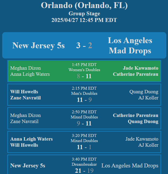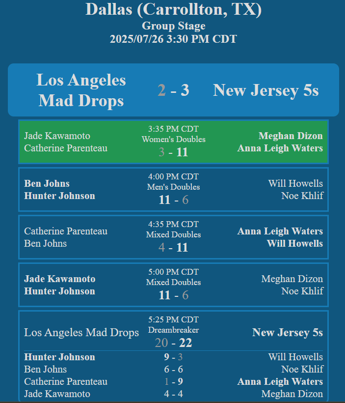 - MLP Mid-Season Tournament (July) - Las Vegas Night Owls - 3-2